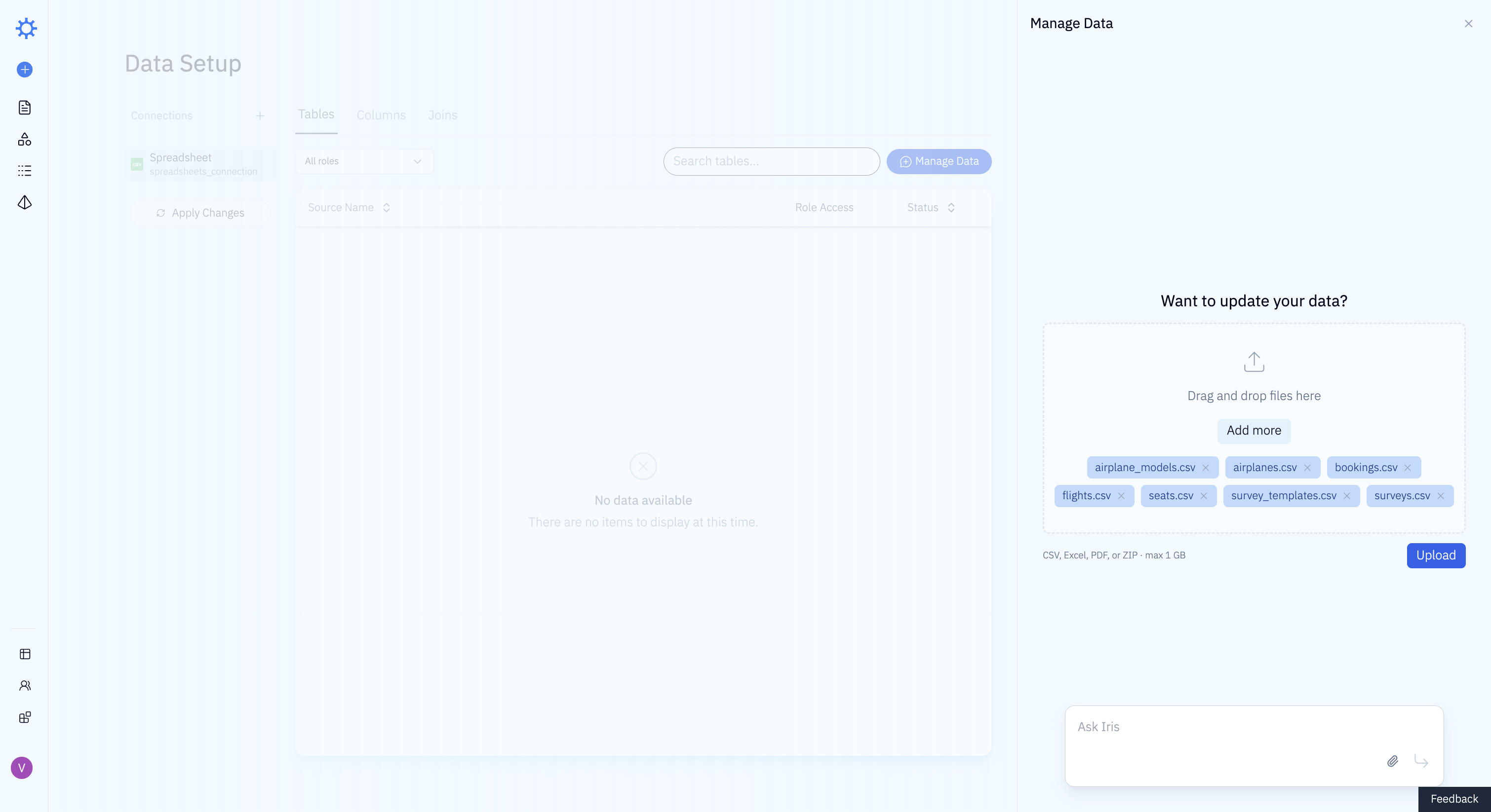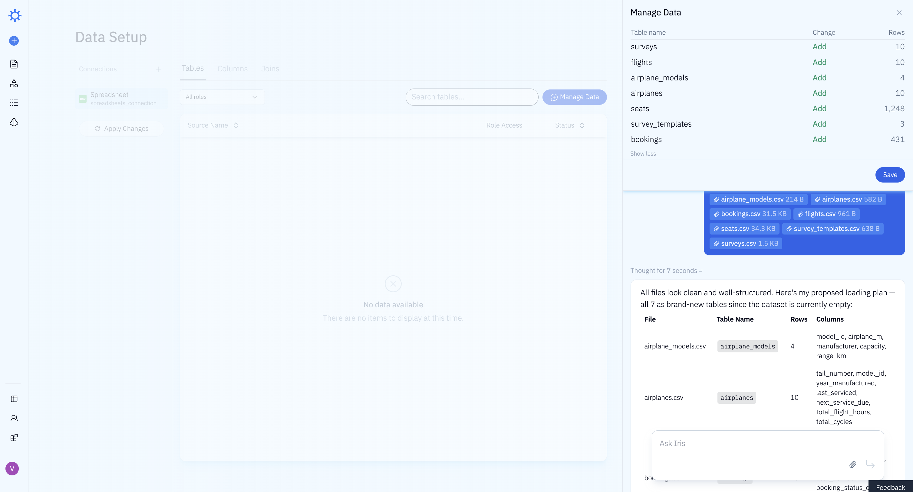 Loading data into Iris was a single action. We dragged and dropped all 7 files at once and uploaded them.