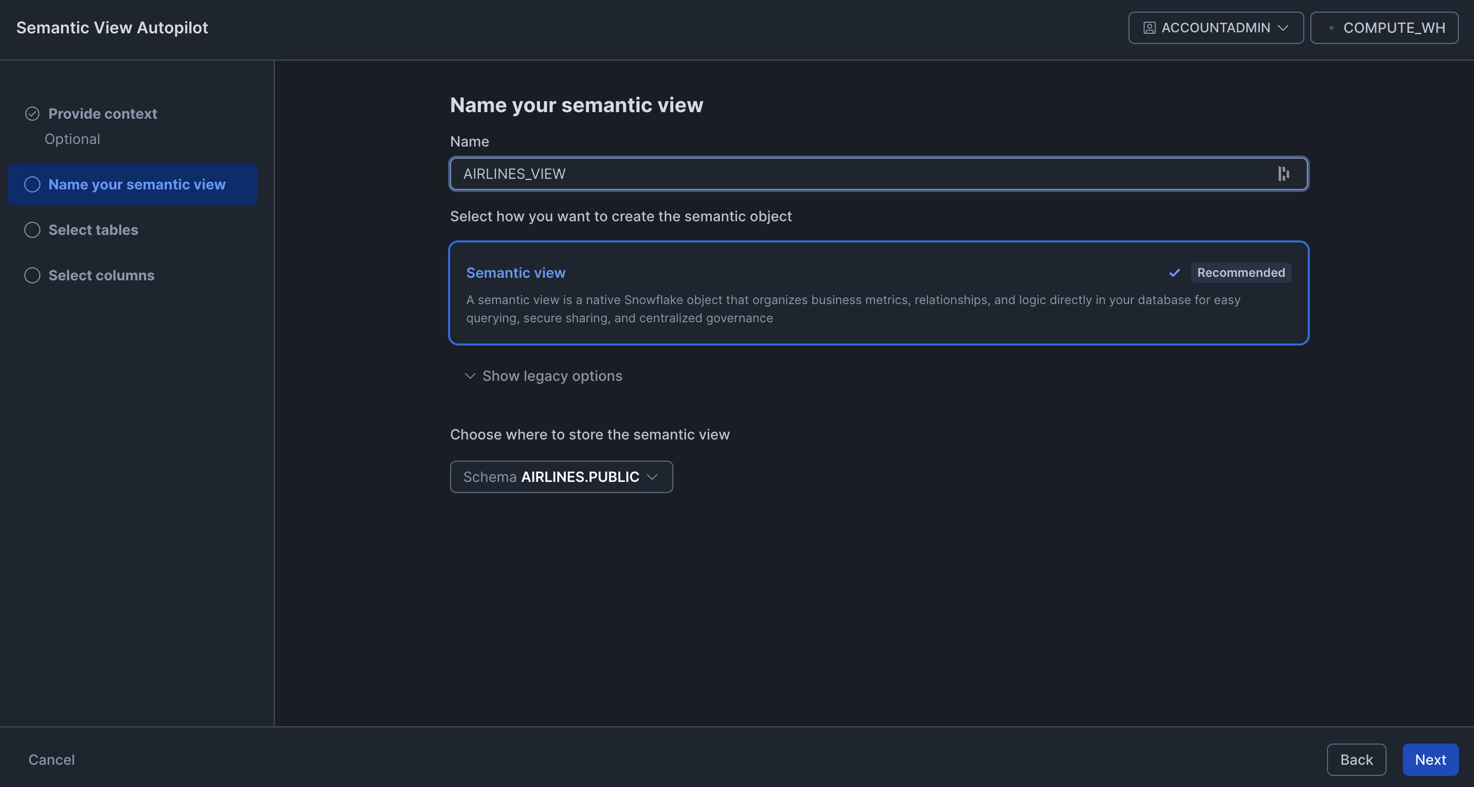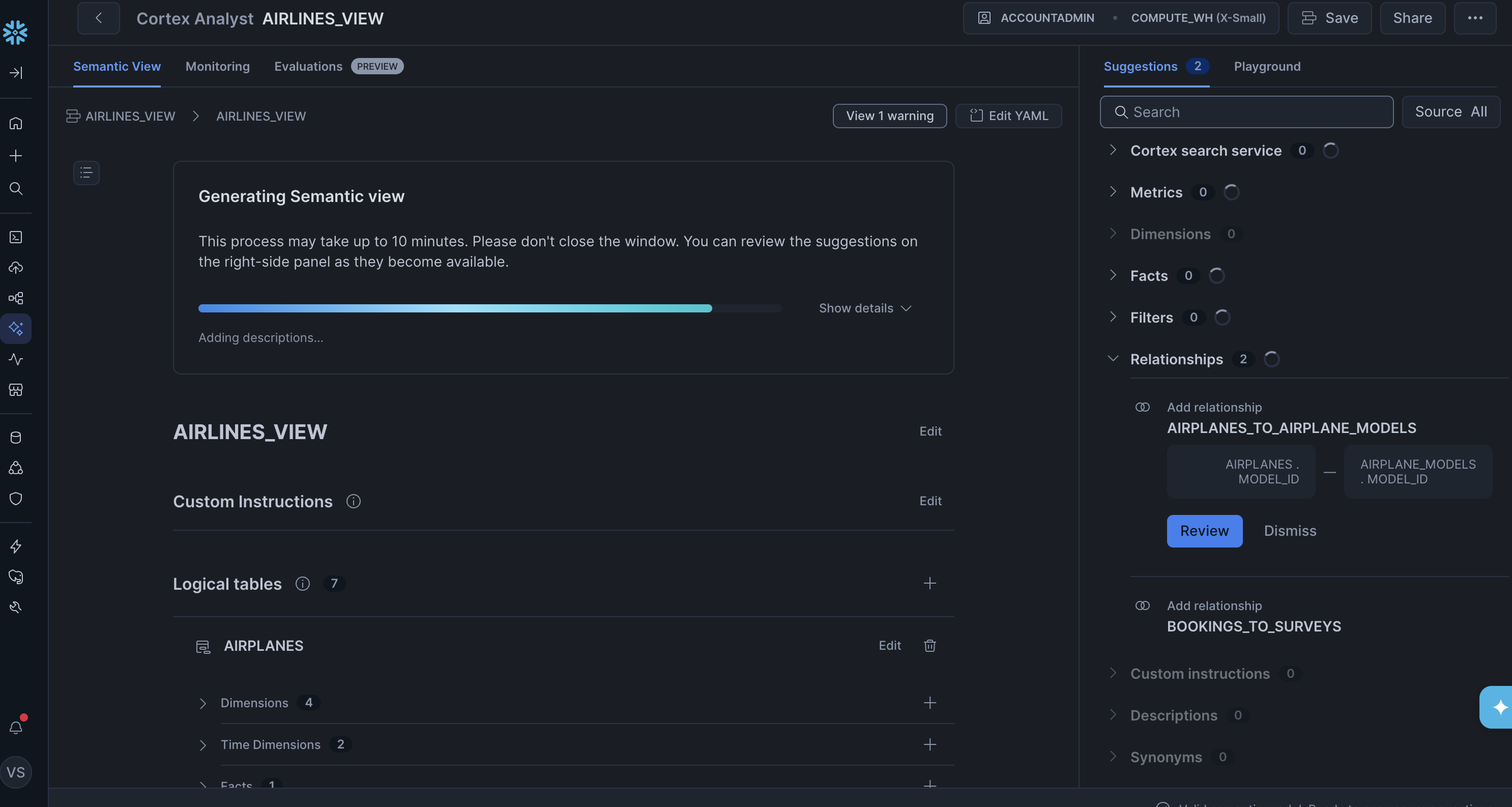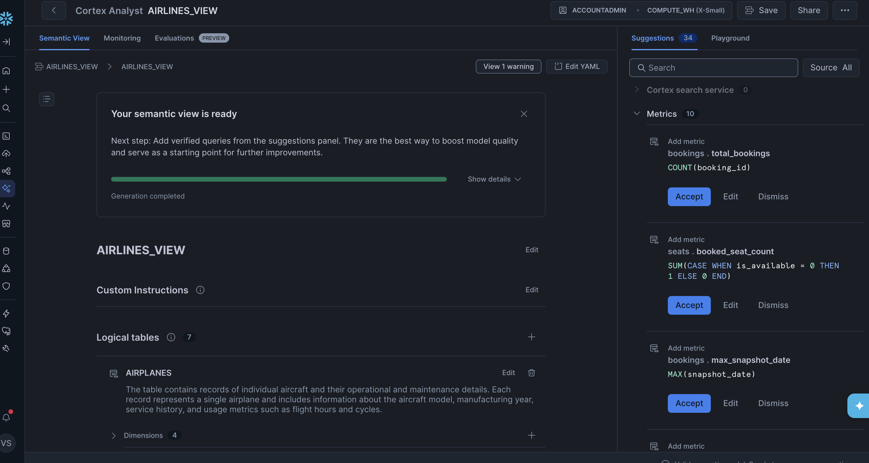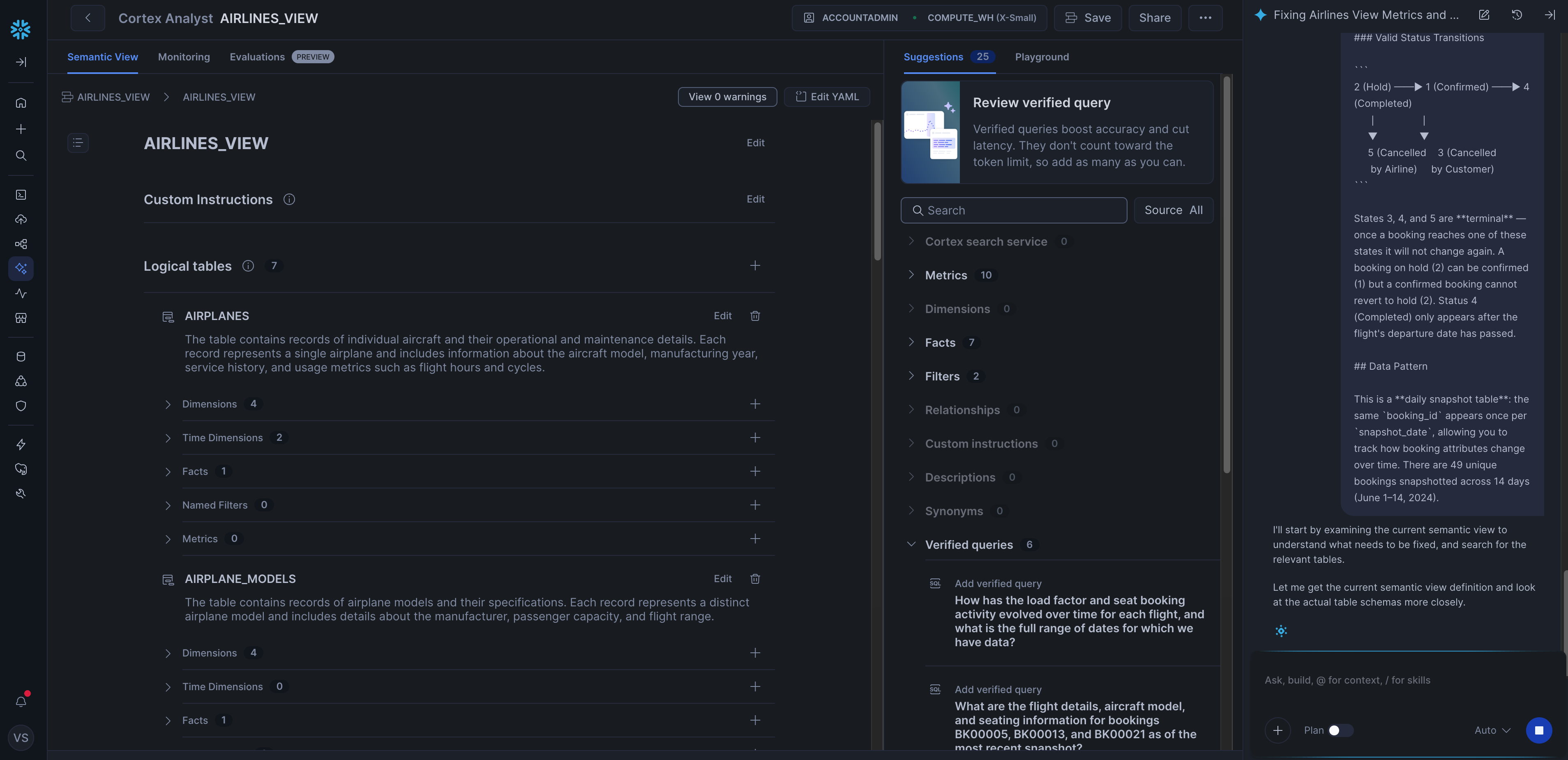 A Semantic View is a structured definition of the data that the Analyst uses to understand and query the schema. Snowflake has a Semantic View Autopilot that auto-generates one from your schema, which we hoped would make this step straightforward.
