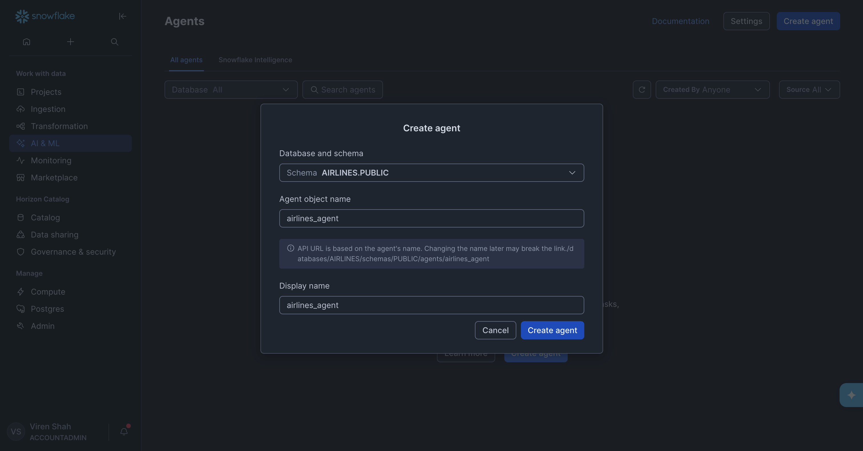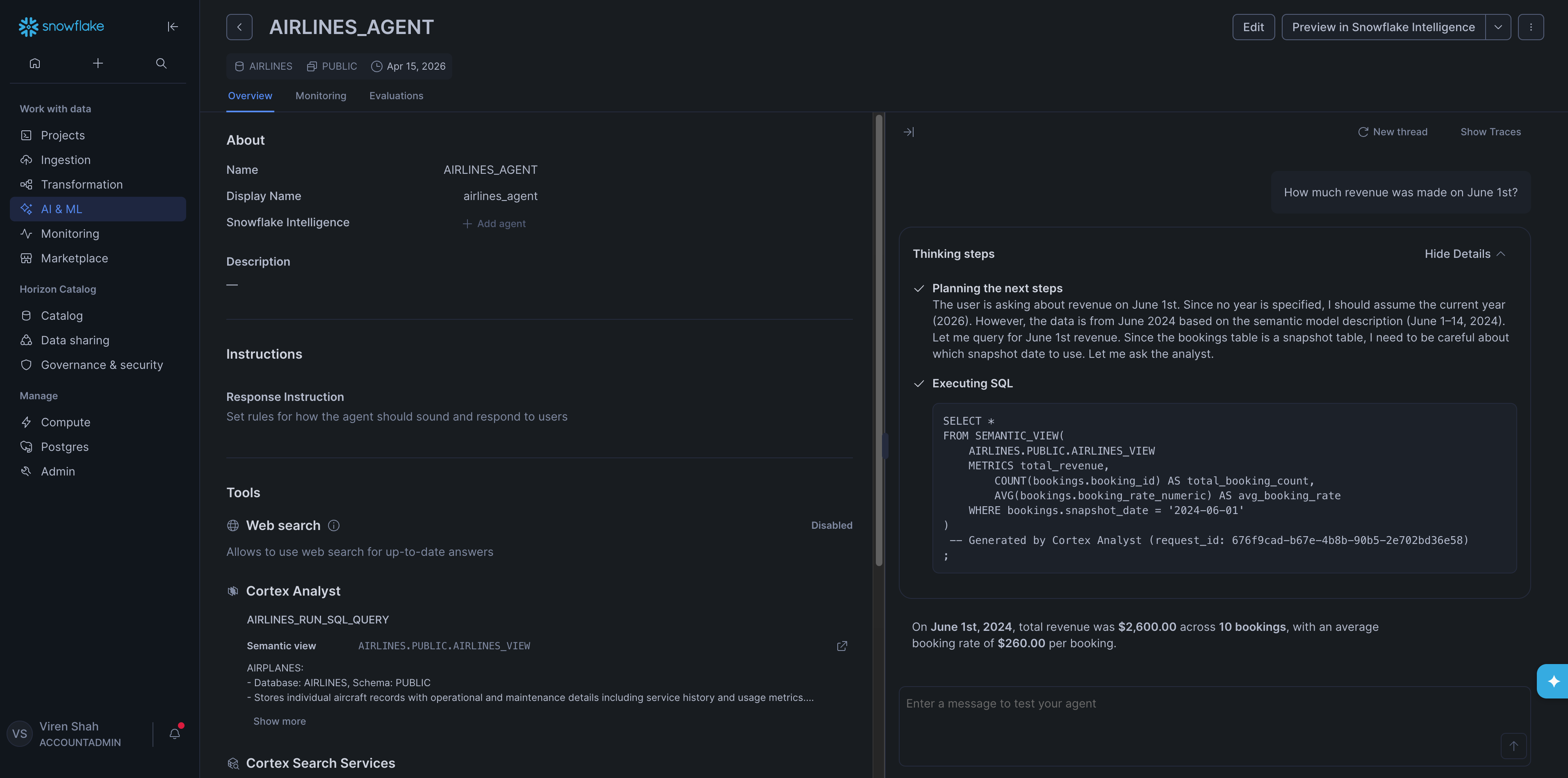 With the Semantic View in place, we could finally create the agent.