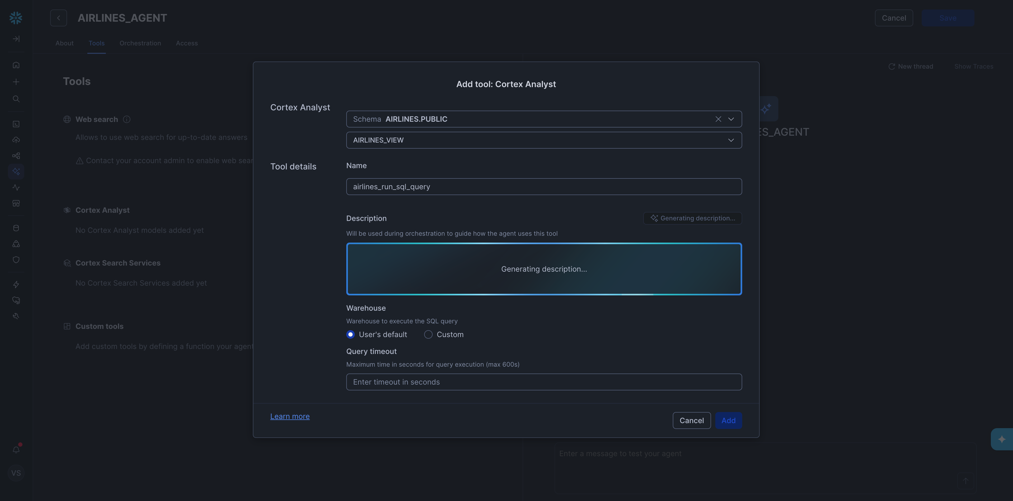 Inside the agent setup, we then added a Cortex Analyst tool and pointed it at the semantic view we had just created.