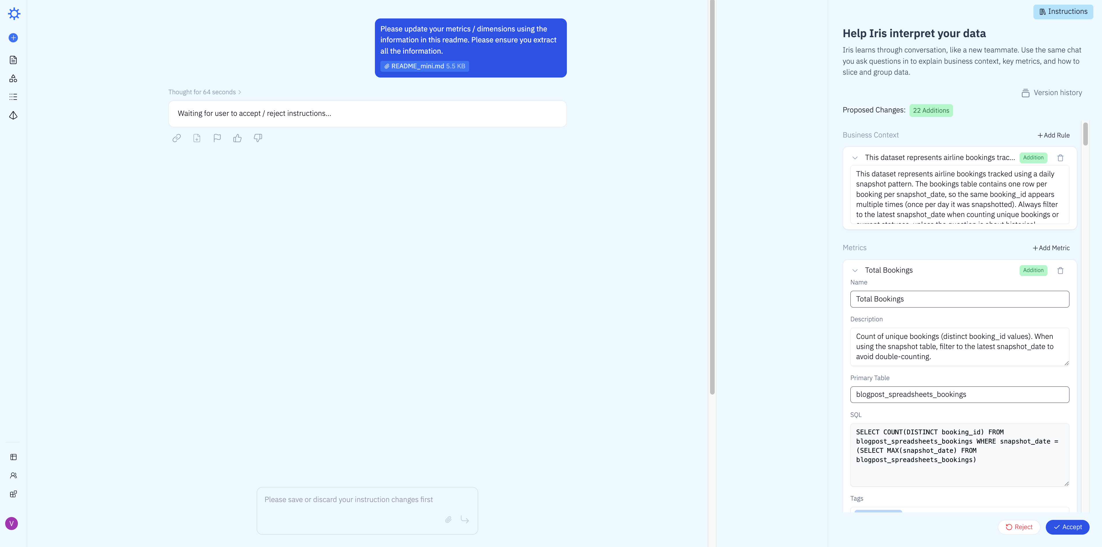 Iris processed the README and proposed 22 additions to its business context — new metrics, dimensions, and join definitions inferred directly from the schema description. We reviewed and accepted them in one click.