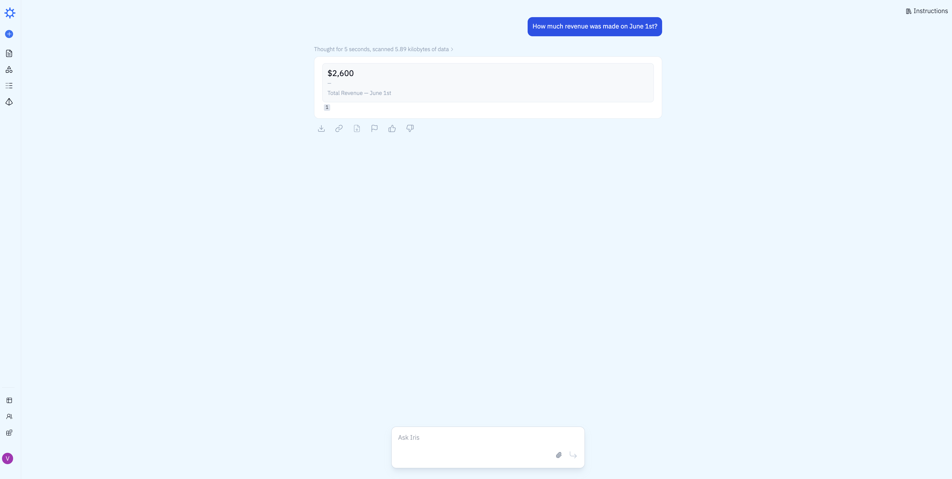 We then asked all 5 diagnostic questions sequentially. All 5 came back correct on the first attempt — no iteration needed. Here's an example: Iris answered "How much revenue was made on June 1st?" correctly in 5 seconds, scanning 5.89 KB of data.