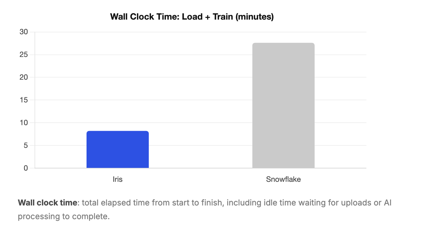 Loading the dataset into Iris took 1 min 20 sec of active user time and 3 min 30 sec of wall clock time. The difference reflects time spent waiting for uploads to complete and for the LLM to process the schema, not additional work required from the analyst.
