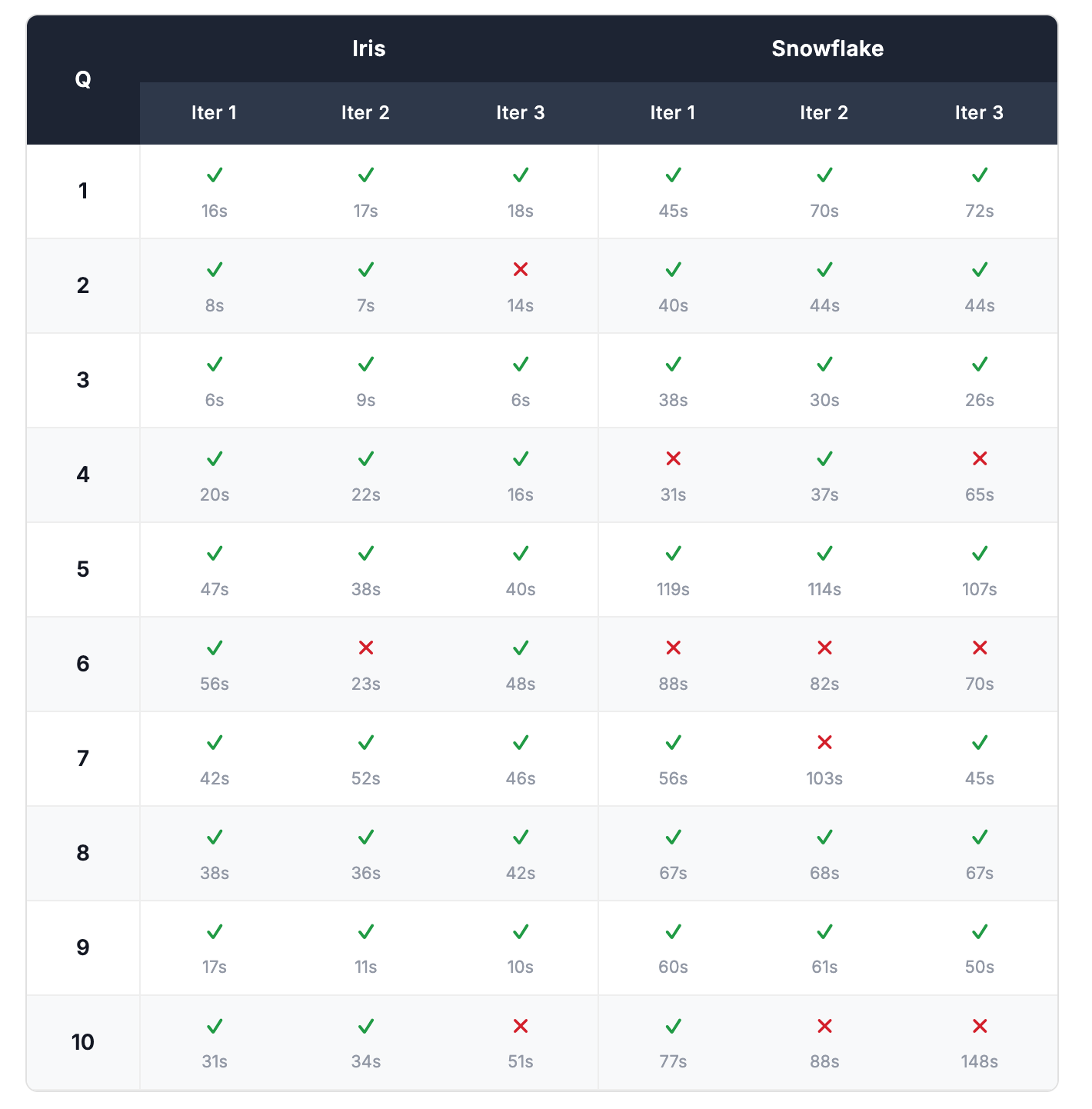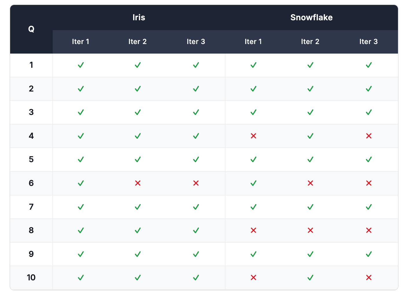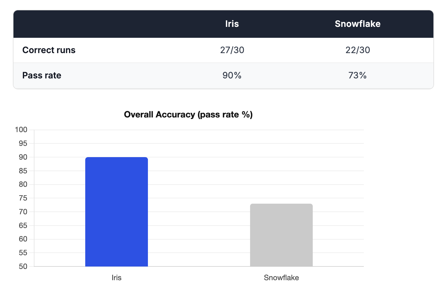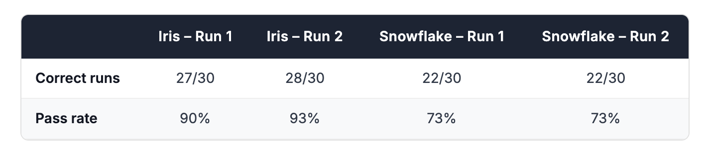 The overall scores held. Snowflake scored exactly 22/30 in both runs. Iris scored 27/30 in Run 1 and 28/30 in Run 2 — a consistent 90%+ pass rate in both cases.