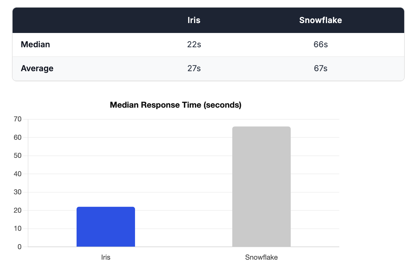 Because our test dataset was small, both tools trained relatively quickly in absolute terms. But the roughly 3x speedup in Iris's active training time matters more than it might appear. On a real production schema with dozens of tables, more complex relationships, and a larger README, that multiplier compounds. The gap between tools would likely be significantly wider in a real deployment.